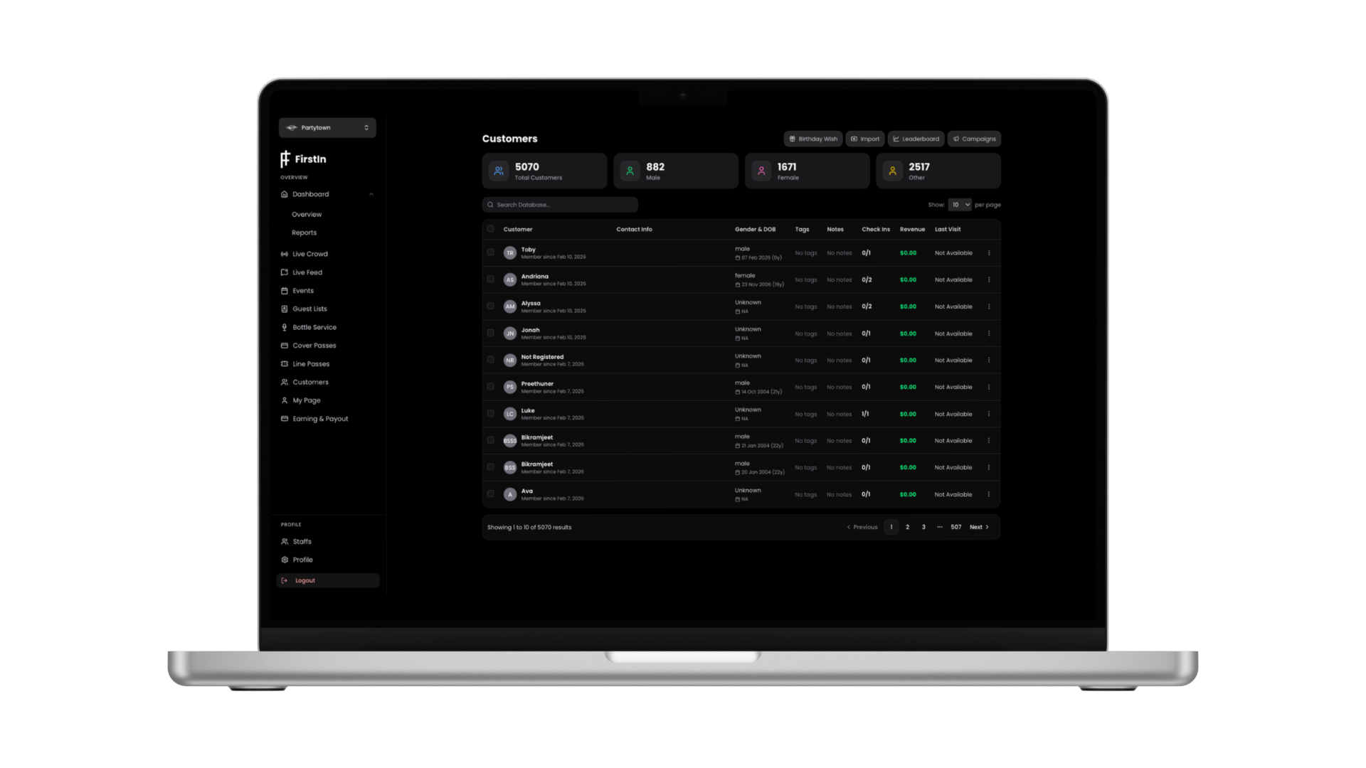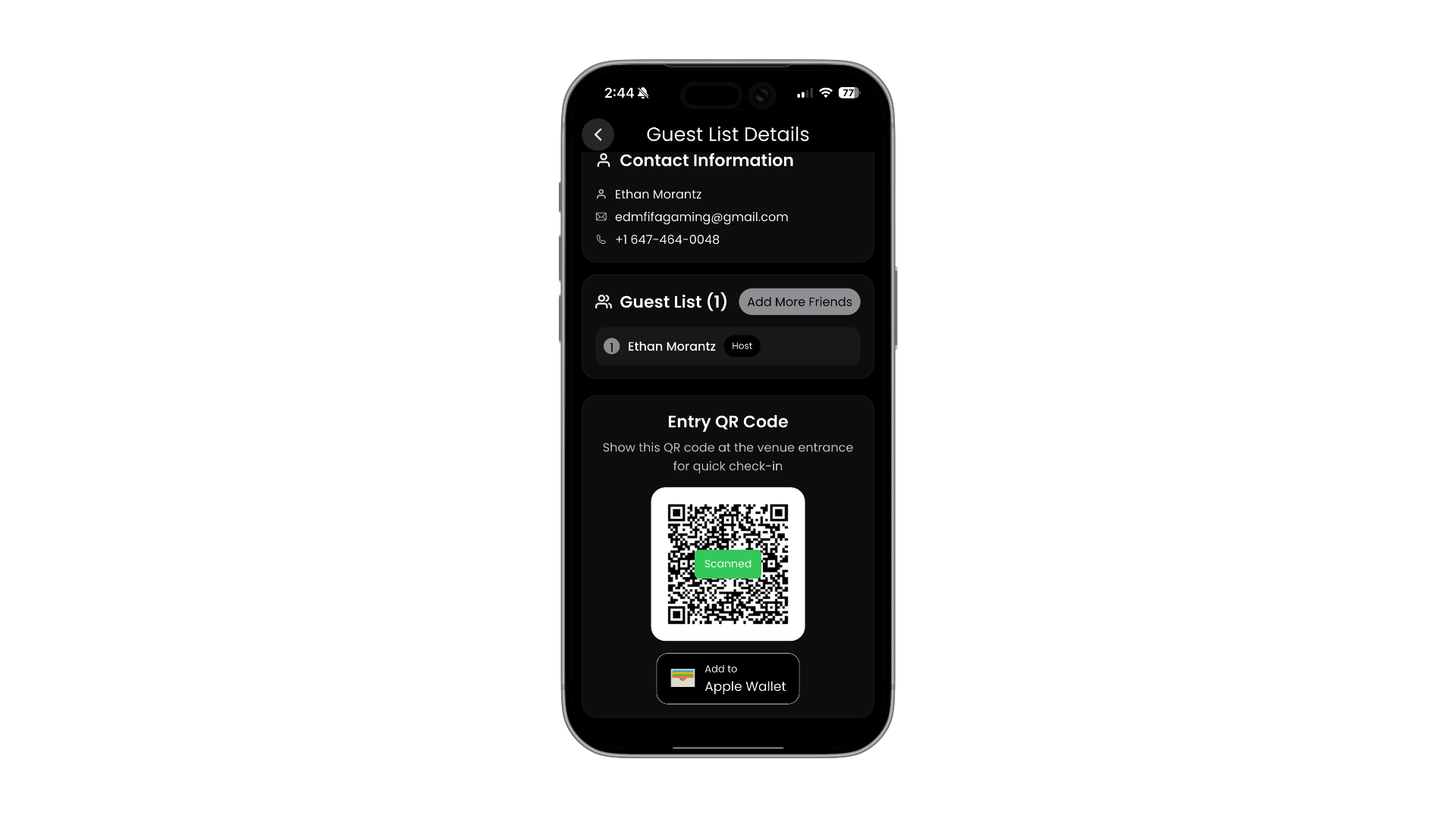 Door staff scans QR codes for instant check-in. Export your full guest list anytime as CSV.